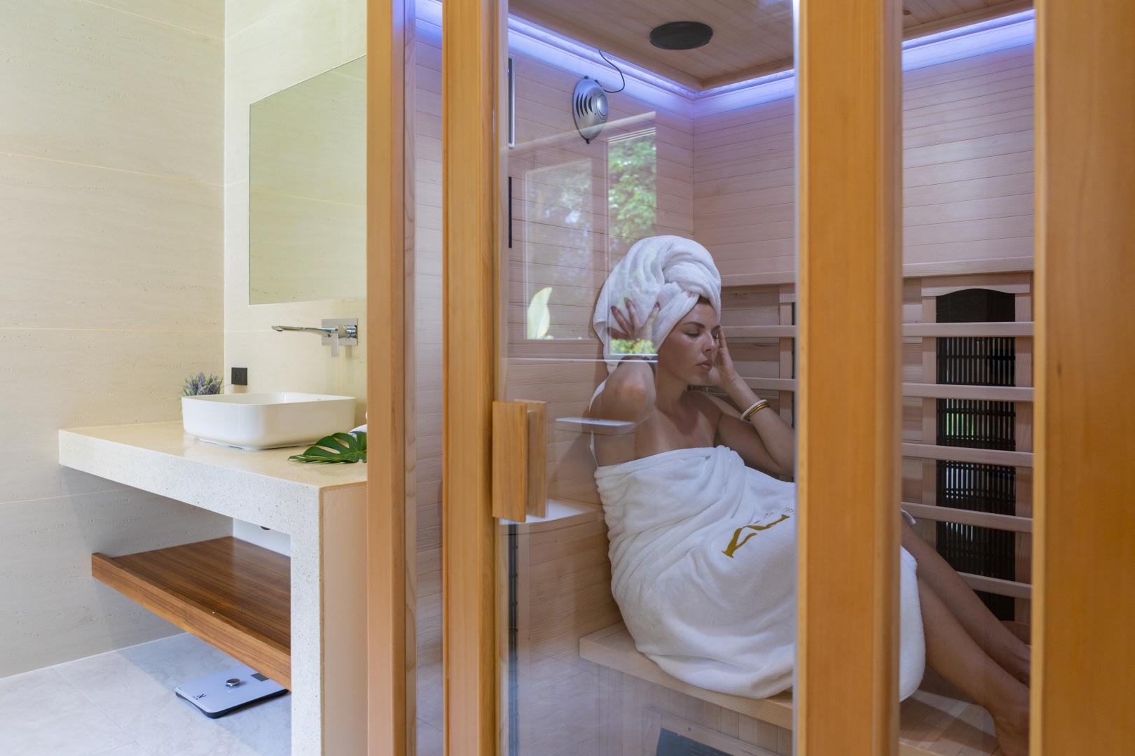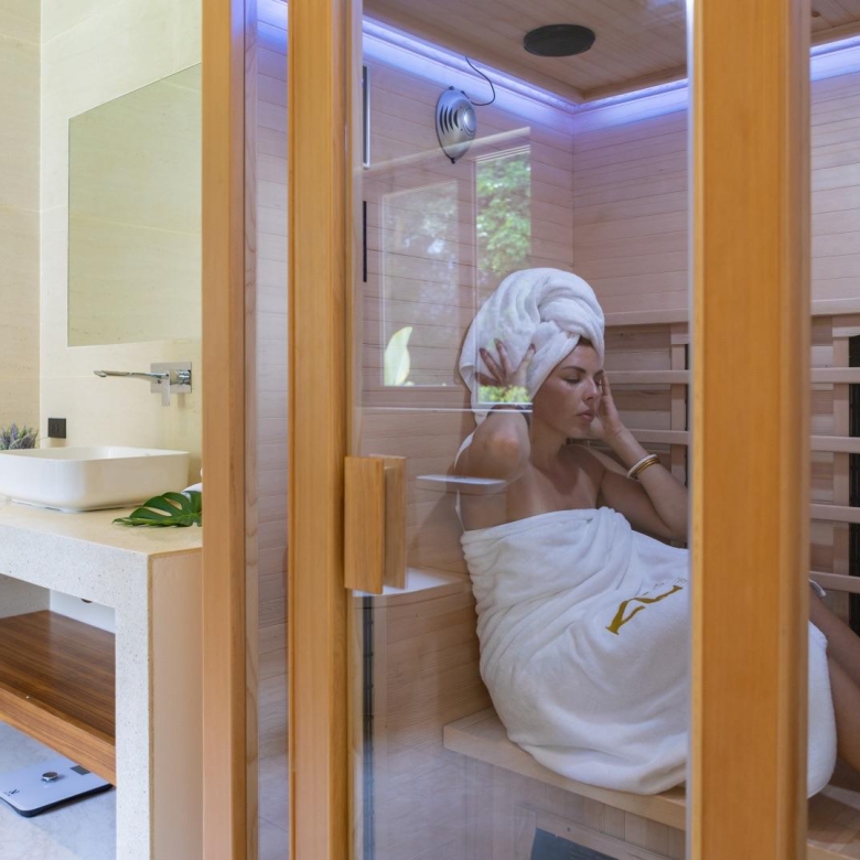 The sixth suite, facing the garden, includes a private sauna and hammam for an intimate and enveloping relaxation experience.